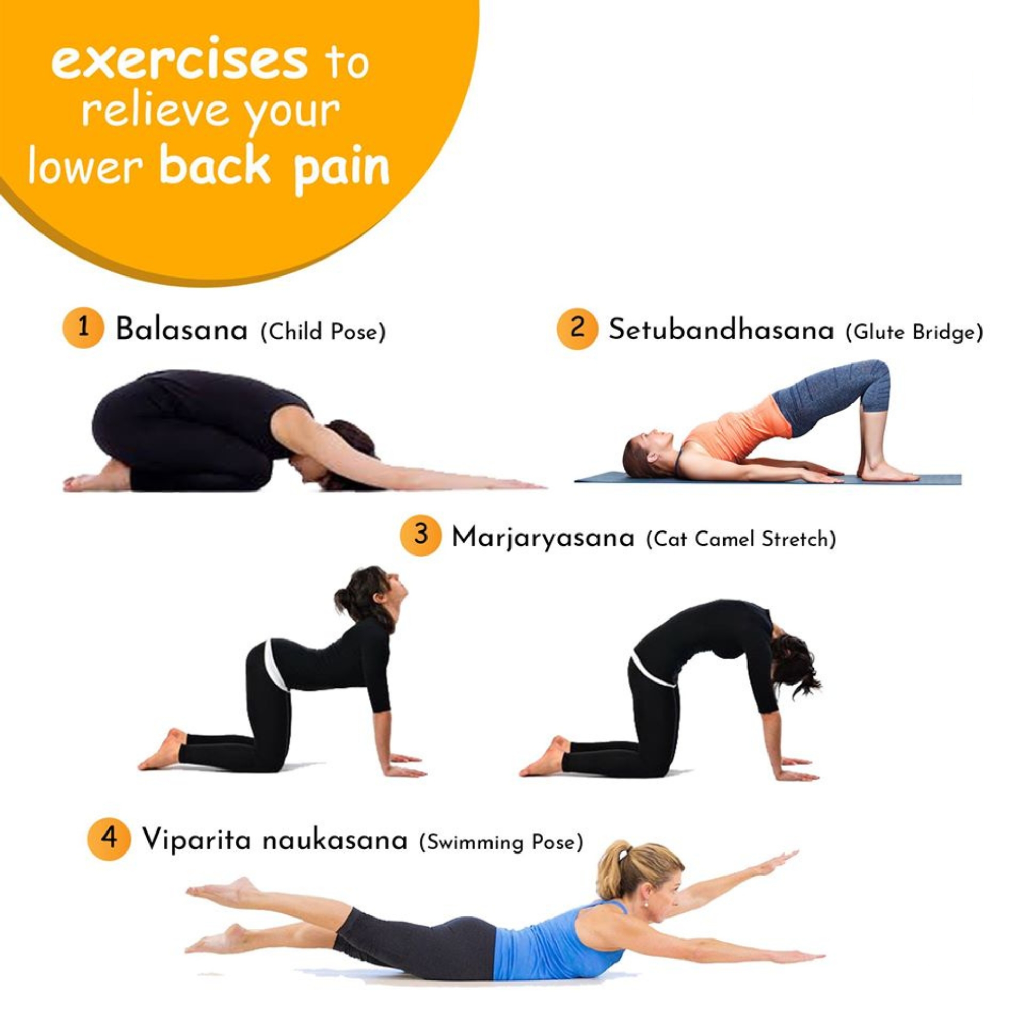 Given below are a few exercises that can relieve you from lower back pain. Here, we try to improve the strength of muscles around your lower back such that the strain on your spinal cord and disc is minimal. This will provide great relief, improve your posture, reduce your pain, and keep your spine healthy.