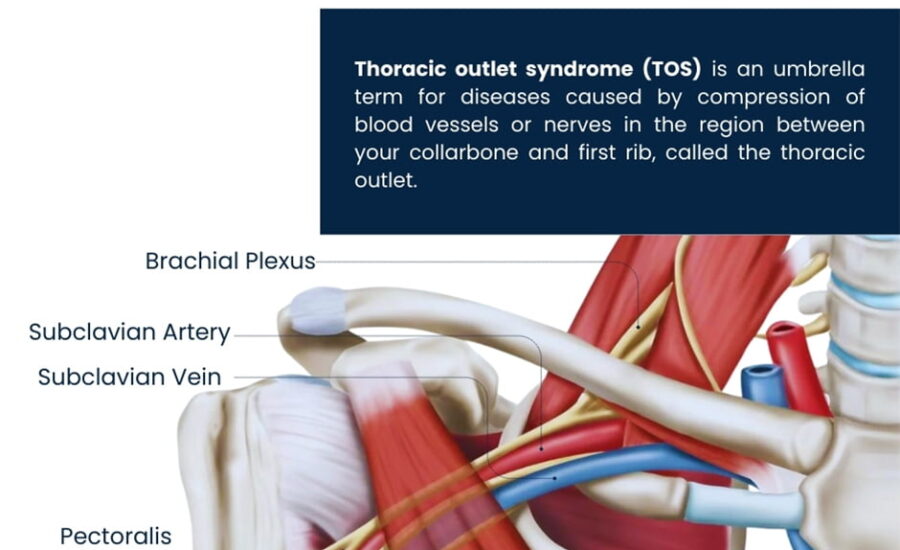 Thoracic outlet syndrome (TOS) is an umbrella term for diseases caused by compression of blood vessels or nerves in the region between your collarbone and first rib, called the thoracic outlet. Normally, your thoracic outlet is large enough to accommodate these nerves and blood vessels. TOS often results in shoulder pain, neck pain and numbness in your fingers.